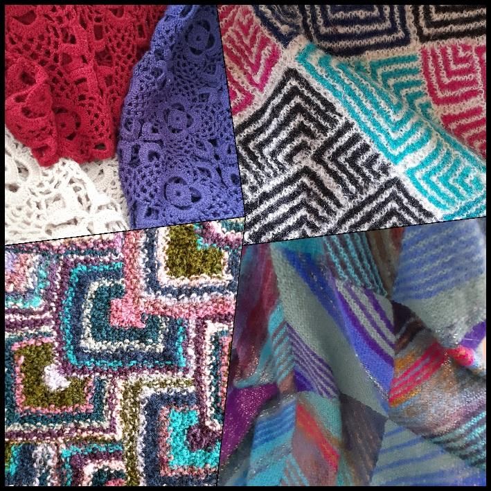 Ann Faulkner, the group leader, is the author of the two pictures on this web page. The top picture is a collage of several of Ann's designs using crochet as well as knittings. The bottom is a mohair throw made from several squares knitted separately and sewn together. The stripes use toning colours from Ann's mohair stash and were designed using the Fibonacci sequence.