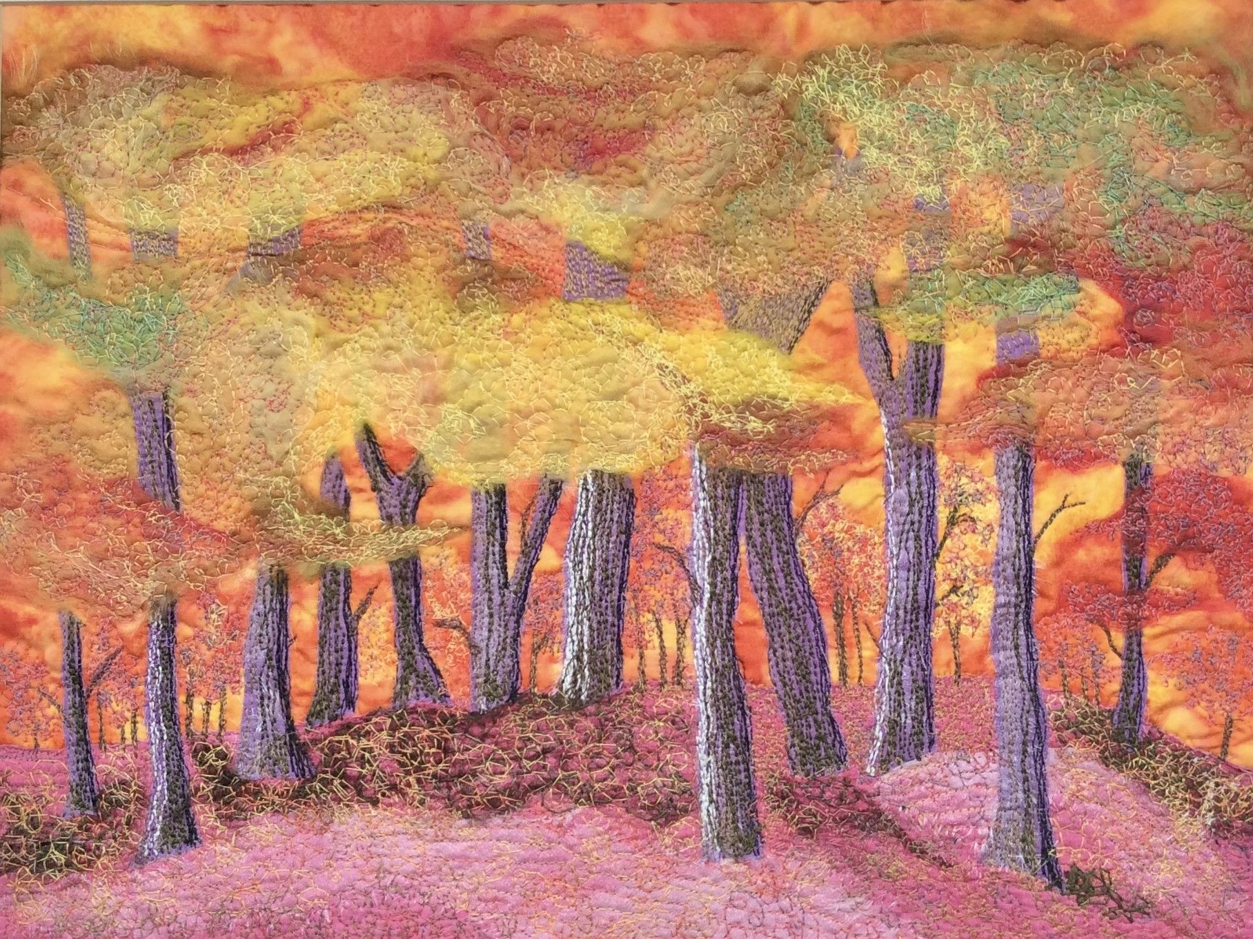 My picture depicts a roaring forest fire and is a fabric collage with machine top stitching.