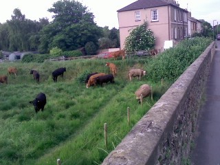Shirley, St Ives U3A, Cattle trying to escape? I walk this way every morning and have never seen this little herd so near the road - and so adventurous re clambering.