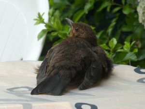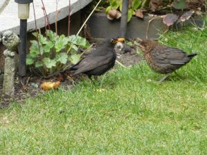 This blackbird chick enjoying a rest on Gillian’s, Wrexham U3A, plastic cover on her patio table. It allowed Gillian to get within 4 feet without stirring. The blackbirds that visit Gillian’s garden all year round are particularly fond of apple cores, and the male blackbird in the picture on the right was not sure whether to feed the apple to its chick or hide it so it could eat it himself.