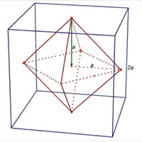 The octahedron is made up of an upper pyramid and a lower pyramid. The height h of each pyramid equals a. By Pythagoras the base of the pyramids is a square of side length √2a. So, the surface area B of the base equals 2a2.